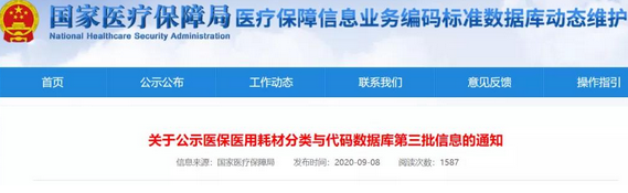 核心提示:  9月10日訊 9月8日,國家醫(yī)保局發(fā)布通知顯示,開始公示醫(yī)保醫(yī)用耗材分類與代碼數(shù)據(jù)庫第三批信息,經(jīng)公示無異議后,第三批醫(yī)
