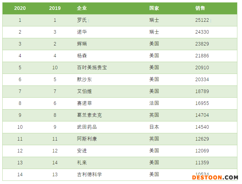 另外,百時(shí)美施貴寶因?yàn)橥瓿蓪?duì)新基的并購(gòu),排名超越默沙東,上升至第 5 位,艾伯維雖然也并購(gòu)了艾爾建,但由于并過(guò)來(lái)的不少產(chǎn)品銷(xiāo)售下降,故整體增長(zhǎng)不多,排名保持不變,仍處于第 7 位。