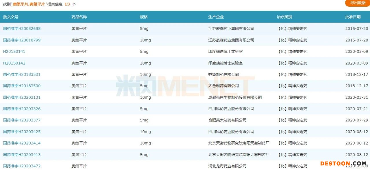 截至目前,奧氮平片共有10家生產(chǎn)企業(yè),其中,江蘇豪森藥業(yè)集團、齊魯制藥、四川科倫藥業(yè)、成都苑東生物制藥等8家是國內(nèi)企業(yè)。
