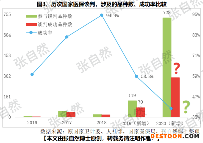 本次共有751個品種通過了形式審查,除23個需要調(diào)整支付價和適應(yīng)癥、功能主治等發(fā)生了變化的原先談判品種外,本次新增728個,其中,西藥551個,中藥177個,是歷次最多的,2019年國談,共有70個新增品種談判成功,其中西藥52個、中藥18個。