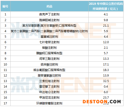 米內網(wǎng)數(shù)據(jù)顯示,17種帶量采購藥品2019年在中國城市公立醫(yī)院、縣級公立醫(yī)院、城市社區(qū)中心以及鄉(xiāng)鎮(zhèn)衛(wèi)生院(簡稱中國公立醫(yī)療機構)終端銷售額超過10億元的有9個。