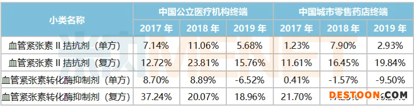 從各小類近幾年的銷售額增速情況來看,血管緊張素II拮抗劑(復(fù)方)、血管緊張素轉(zhuǎn)化酶抑制劑(復(fù)方)無論在中國公立醫(yī)療機(jī)構(gòu)終端還是在中國城市零售藥店終端每年都有超過10%以上的增長,市場潛力不容小覷。