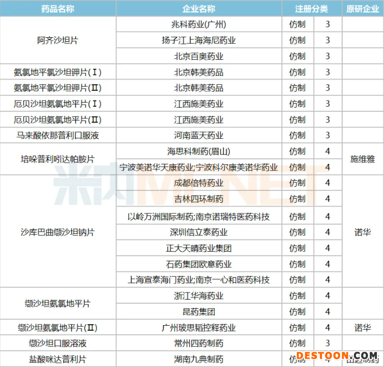 2020年至今,已有恒瑞、北京百奧藥業(yè)、花園藥業(yè)的纈沙坦氨氯地平片(Ⅰ)4類仿制上市申請獲批并視同過評,產(chǎn)品投入市場后將打破諾華獨占市場的局面,同時“3仿制+1原研”的格局已經(jīng)形成,若被下一批國家集采納入目錄,將加速國產(chǎn)仿制藥分食市場。