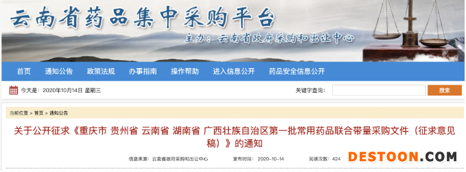 10月14日,云南省藥品集中采購(gòu)平臺(tái)掛出《重慶市 貴州省 云南省 湖南省 廣西壯族自治區(qū) 第一批常用藥品聯(lián)合帶量 采購(gòu)文件(征求意見稿)》,意味著5?。ㄊ小^(qū))第一批常用藥聯(lián)合帶量采購(gòu),正式開始;本次采購(gòu)主要涉及18個(gè)臨床用量大、采購(gòu)金額高且競(jìng)爭(zhēng)較為充分的常用藥。