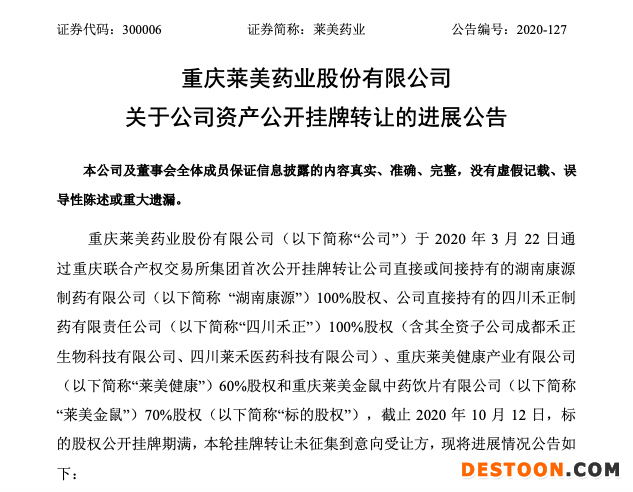 10月14日,萊美藥業(yè)發(fā)布公告,披露公司公開掛牌轉(zhuǎn)讓4家子公司的進(jìn)展。公告顯示,截至2020年10月12日,標(biāo)的股權(quán)公開掛牌期滿,本輪掛牌轉(zhuǎn)讓未征集到意向受讓方。也就是說,經(jīng)歷了8次掛牌,萊美藥業(yè)轉(zhuǎn)讓子公司股權(quán)仍然難覓買家。