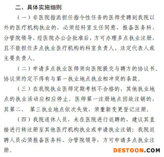 即使?jié)M足了申請條件,在具體實施細(xì)則上,文件明確表示,非醫(yī)院指派擔(dān)任指令性任務(wù)的醫(yī)師受聘到外院醫(yī)療機(jī)構(gòu)執(zhí)業(yè)的,必須經(jīng)科室主任同意,并報備醫(yī)務(wù)科、分管院領(lǐng)導(dǎo),并經(jīng)醫(yī)院辦公會批準(zhǔn)后,方可辦理多點(diǎn)執(zhí)業(yè)注冊,且不能擔(dān)任多點(diǎn)執(zhí)業(yè)醫(yī)療機(jī)構(gòu)的科室負(fù)責(zé)人、法人代表或主要負(fù)責(zé)人。