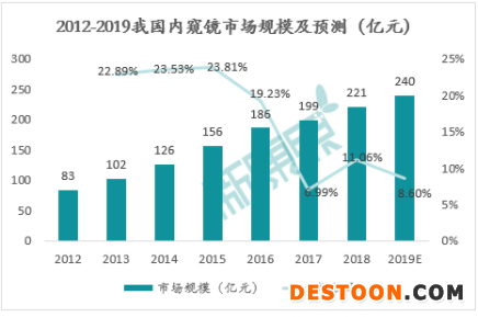 我國內(nèi)窺鏡行業(yè)近年來穩(wěn)步發(fā)展,2012年營收83億元,到2018年已經(jīng)達(dá)到了221億元,預(yù)計到2019年會達(dá)到240億元。但增速有所放緩,2018年市場規(guī)模同比增長11.06%,小于在2016年前超過20%的增速。