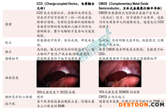 電子內(nèi)窺鏡的核心技術(shù)為圖像采集方式技術(shù),其中圖像傳感器的應(yīng)用則是影像呈現(xiàn)的技術(shù)核心。目前有CCD(電荷耦合元件)和 CMOS(互補式金屬氧化物半導(dǎo)體)兩種技術(shù),CCD技術(shù)由于影像質(zhì)量更好,在電子內(nèi)窺鏡發(fā)展初期被廣泛應(yīng)用,然而,隨著CMOS在色彩性能方面的提升,影像質(zhì)量以及與CCD差距越來越小,而其低耗能、噪聲小的特點為企業(yè)所欣賞,CCD向CMOS的轉(zhuǎn)變將是未來一段時間的發(fā)展趨勢。