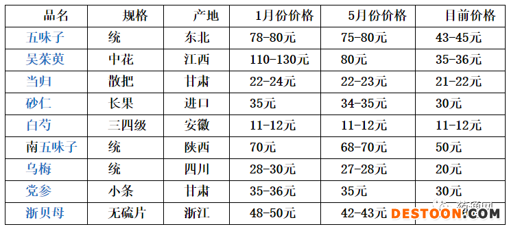 據(jù)藥通網(wǎng)最新數(shù)據(jù)顯示,今年以來,有不少中藥材的價(jià)格下降是比較明顯的。有的是年初就大幅降價(jià),一直沒漲回來,例如當(dāng)歸、白芍、黨參等;有的是價(jià)格在持續(xù)下滑的,例如五味子、吳茱萸、浙貝母等。