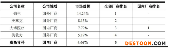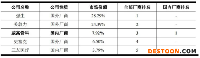 2019年度,威高骨科以5.12%的市場(chǎng)份額,位居骨科植入醫(yī)療器械領(lǐng)域國(guó)內(nèi)第4,是唯一進(jìn)入前5的國(guó)產(chǎn)廠商,同時(shí)整體市場(chǎng)份額位居國(guó)內(nèi)廠商第一,足以窺見其強(qiáng)勁實(shí)力。