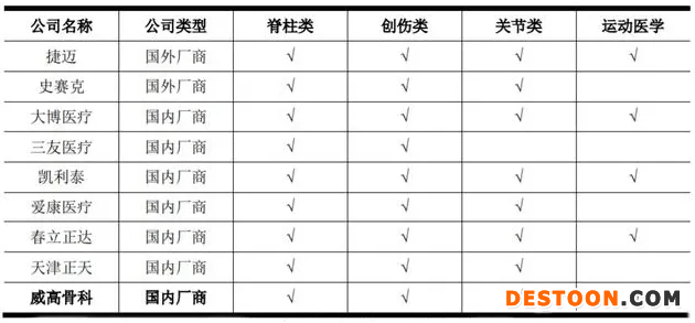 威高骨科是國(guó)內(nèi)產(chǎn)品線最齊全的公司,產(chǎn)品覆蓋了創(chuàng)傷、脊柱和關(guān)節(jié)等多個(gè)品類,且均有較強(qiáng)的競(jìng)爭(zhēng)力。