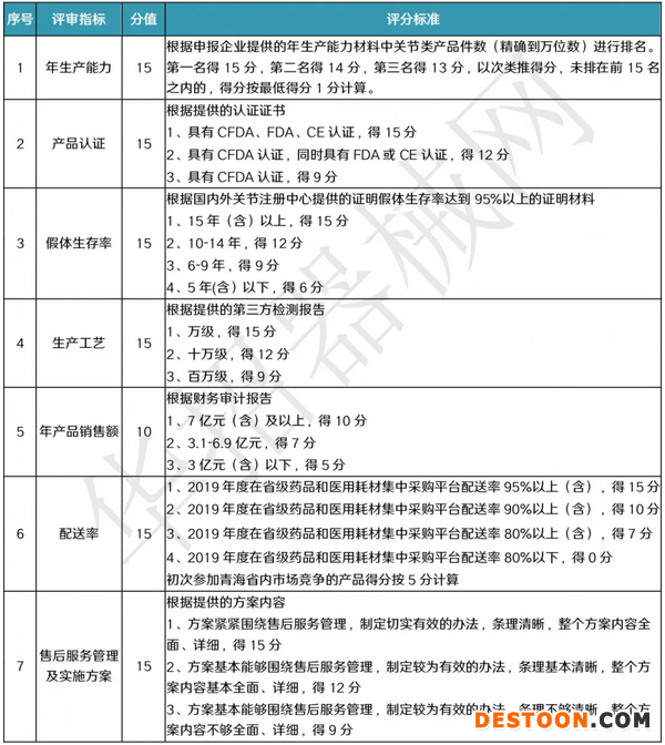 第一輪評(píng)審組根據(jù)年生產(chǎn)能力、產(chǎn)品認(rèn)證、假體生存率、生產(chǎn)工藝、年產(chǎn)品銷售額、配送率、售后服務(wù)管理及實(shí)施方案等7項(xiàng)評(píng)審指標(biāo)進(jìn)行綜合評(píng)分,依據(jù)綜合得分排序,國(guó)產(chǎn)、進(jìn)口前6家申報(bào)企業(yè)進(jìn)入談判議價(jià)環(huán)節(jié)(不足6家的全部進(jìn)入)。