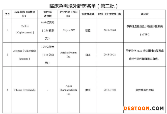 10月30日訊 10月29日,CDE公示了第三批臨床急需境外新藥名單,包括丹麥制藥商Ablynx的納米抗體藥物Cablivi、安斯泰來的FLT3抑制劑Xospata、美國制藥公司Agios的白血病藥物Tibsovo等 7款境內(nèi)未上市且臨床急需的特效藥,治療領(lǐng)域涉及血液系統(tǒng)疾病、惡性血液疾病、遺傳代謝性疾病、神經(jīng)系統(tǒng)、感染性疾病和眼部疾病。