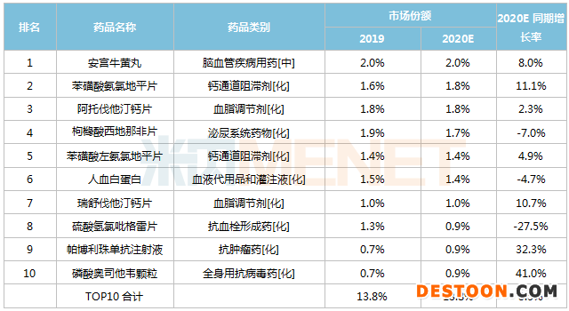 表1:2020E零售終端城市實(shí)體藥店處方藥TOP10品種排名及增長趨勢
