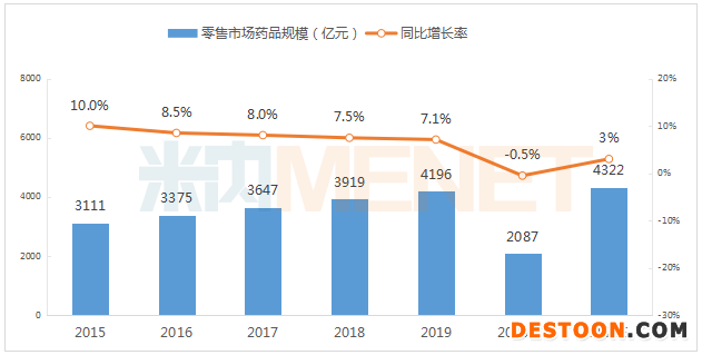 2020上半年,受“新冠”疫情影響,在人們盡量減少出行與消費的情況下,2020上半年零售終端的藥品銷售規(guī)模出現(xiàn)負增長,但隨著人們生活逐漸恢復正常,經(jīng)濟回暖,預計2020全年零售終端的藥品規(guī)模將達到4322億元,同比去年增長3%。
