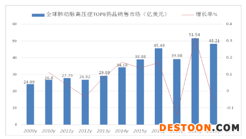 2019年,全球肺動(dòng)脈高壓原研TOP8治療藥物銷售額在50億美元左右,同比上一年略有下滑。這并不包括抗ED適應(yīng)癥的PDE-5抑制劑和前列素系列藥物。預(yù)計(jì)全球肺動(dòng)脈高壓藥物總體市場(chǎng)在100億美元左右。