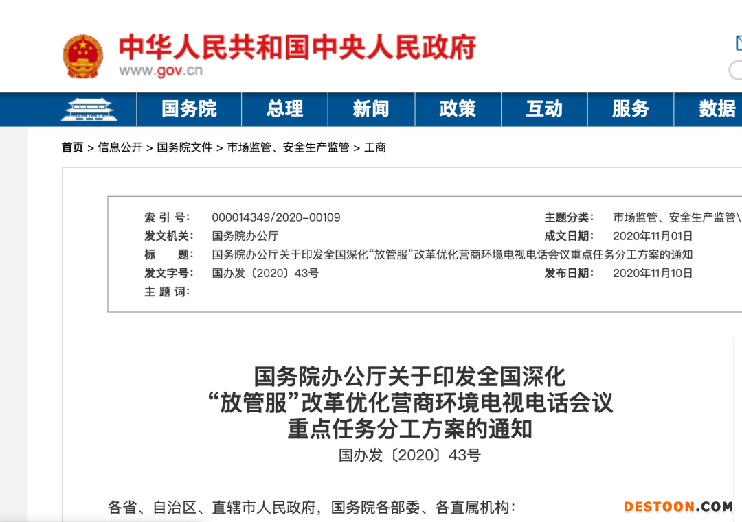11月10日,國務(wù)院辦公廳發(fā)布《國務(wù)院辦公廳關(guān)于印發(fā)全國深化“放管服”改革優(yōu)化營商環(huán)境電視電話會議重點(diǎn)任務(wù)分工方案的通知》(以下簡稱《通知》)。