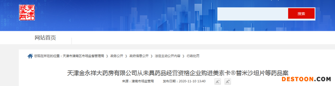 通過(guò)處決書(shū)顯示,天津金永祥大藥房有限公司于2020年5月從無(wú)藥品經(jīng)營(yíng)資質(zhì)人員處購(gòu)買(mǎi)美素卡®替米沙坦片(國(guó)藥準(zhǔn)字J20180016)等藥品,并在所開(kāi)的網(wǎng)店銷(xiāo)售。其中2020年5月21日至2020年7月22日銷(xiāo)售該藥品58筆,銷(xiāo)售金額為8562.76元。