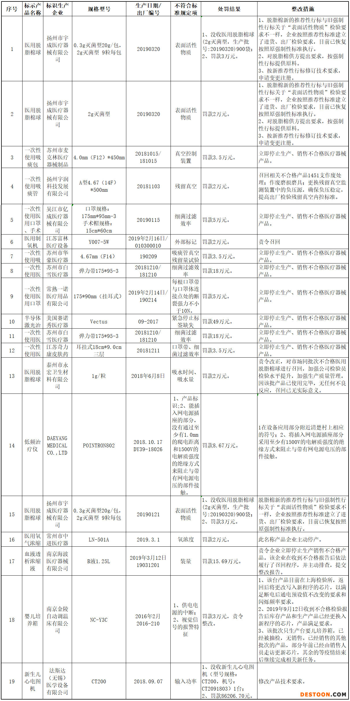 除了械企停產(chǎn),近期,江蘇省藥監(jiān)局還發(fā)布了《江蘇省醫(yī)療器械國(guó)抽通告(2019年第8號(hào))處置情況匯總表》。