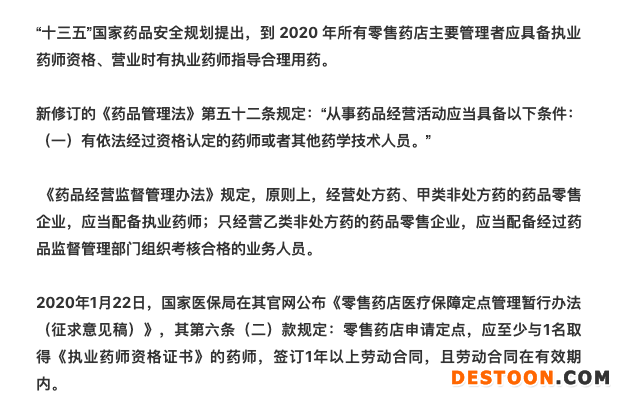 從國(guó)家藥監(jiān)局的通知明確以2025年為期看,最晚到2025年,全國(guó)范圍內(nèi)的零售藥店有望實(shí)現(xiàn)足額配備執(zhí)業(yè)藥師。