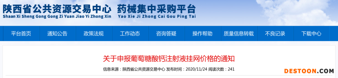 11月24日,陜西省公共資源交易中心發(fā)布《關(guān)于申報(bào)葡萄糖酸鈣注射液掛網(wǎng)價(jià)格的通知》。