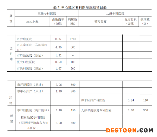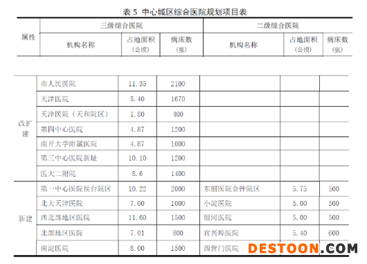根據(jù)規(guī)劃,天津中心城區(qū)規(guī)劃配置綜合醫(yī)院36個,總病床數(shù)30470張。其中:保留現(xiàn)有醫(yī)院19個、改擴建醫(yī)院7個、新建醫(yī)院10個。