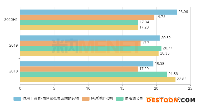 從最近三年的情況來看,2018年心臟病治療用藥以22.83%的份額登頂,血脂調節(jié)劑也占了21.58%;2019年血脂調節(jié)劑沖上了TOP1,作用于腎素-血管緊張素系統(tǒng)的藥物市場份額也沖破20%,心臟病治療用藥被擠在了TOP3的位置;2020上半年,作用于腎素-血管緊張素系統(tǒng)的藥物成為了最新的榜首,其余三大亞類的市場份額均在20%以下。