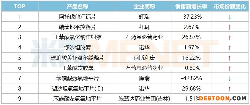 從品牌的情況來看,2019年超10億品牌有22個,其中14個在2020上半年銷售額增速為負值,能堅持下來的都是真英雄。2020H1銷售額破10億的品牌有9個,其中國產品牌占了3個席位。石藥的獨家產品丁苯酞氯化鈉注射液、丁苯酞軟膠囊,以及施慧達的苯磺酸左氨氯地平片榜上有名,三個產品的市場份額均比2019年得到提升,從銷售額增速來看,丁苯酞氯化鈉注射液高達26.57%。