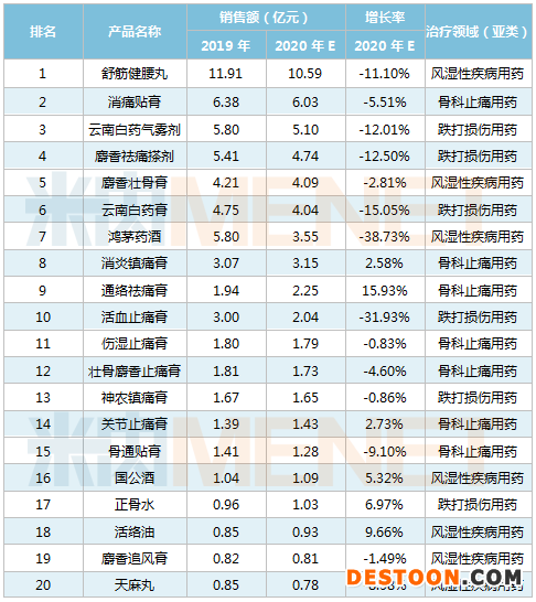 2020年中國城市零售藥店終端骨骼肌肉系統(tǒng)疾病中成藥TOP20廠家預測