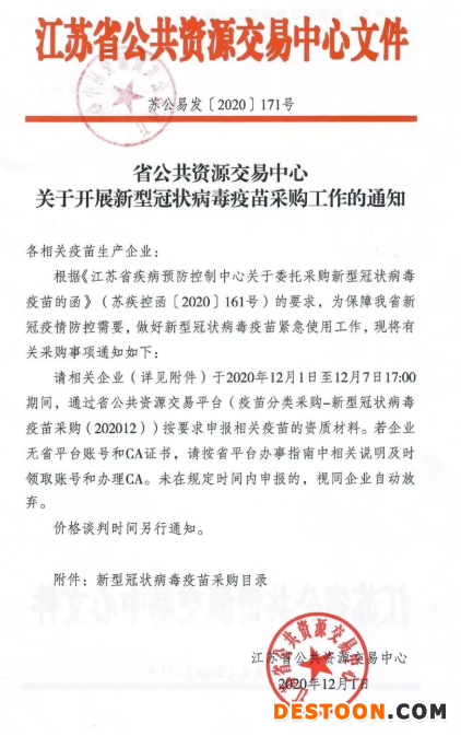 12月1日,江蘇省公共資源交易中心發(fā)布《關(guān)于開展新型冠狀病毒疫苗采購工作的通知》(以下簡稱“通知”)。通知指出,為保障江蘇省新冠疫情防控工作的需要,江蘇省將進行三款新冠疫苗的采購工作。