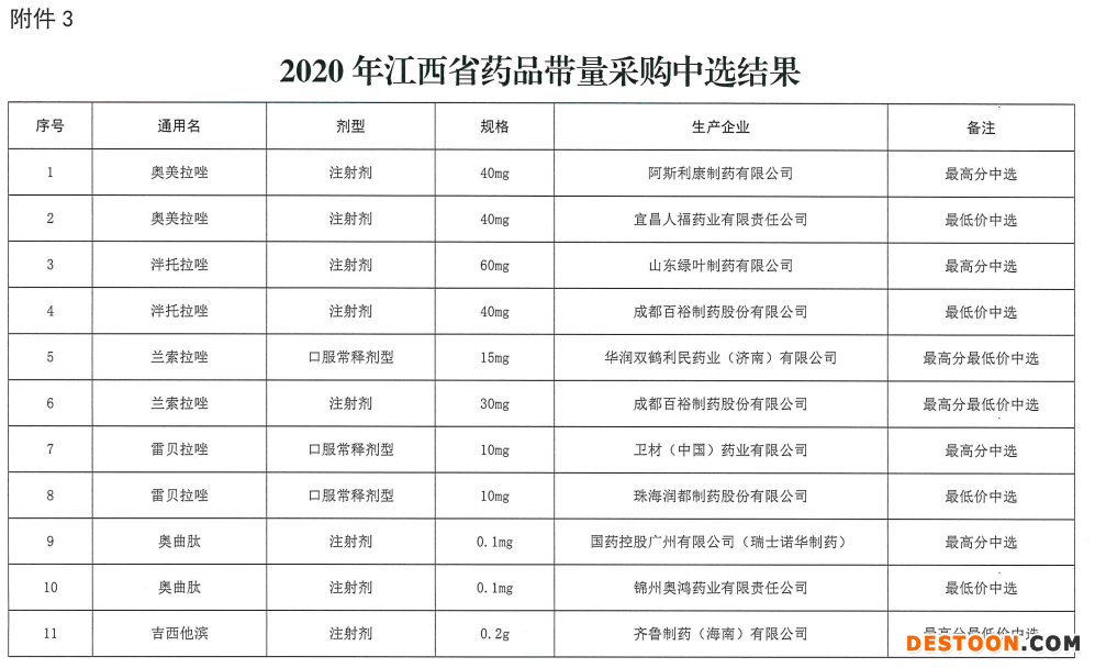 在通知中,江西省公布了2020年江西省藥品帶量采購(gòu)中選結(jié)果——從中選結(jié)果看,奧美拉唑、泮托拉唑、蘭索拉唑、雷貝拉唑、奧曲肽、吉西他濱等藥品有企業(yè)中選,中選藥企有阿斯利康、宜昌人福藥業(yè)、山東綠葉制藥、成都百裕制藥、華潤(rùn)雙鶴利民藥業(yè)、衛(wèi)材中國(guó)、珠海潤(rùn)都制藥、國(guó)藥控股廣州、錦州奧鴻藥業(yè)、齊魯制藥。