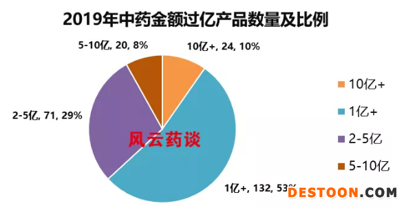 在院內(nèi)銷售的中藥產(chǎn)品過億的有將近250個左右,具體規(guī)模及規(guī)模產(chǎn)品數(shù)量占比,見下圖