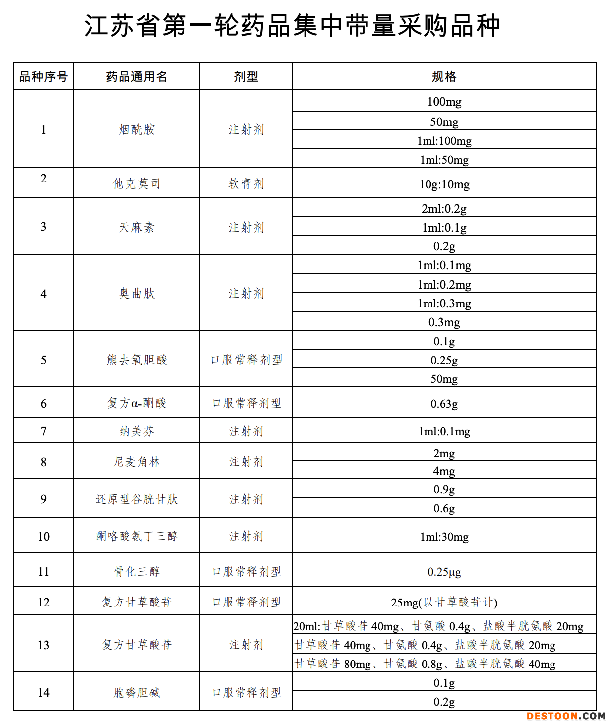賽柏藍(lán)梳理后發(fā)現(xiàn),此次江蘇省共涉及14個(gè)品種,共8個(gè)品種是注射劑,包括奧曲肽、納美芬、尼麥角林和還原型谷胱干肽等。