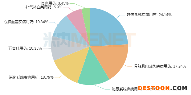 從治療類別看,29個獨(dú)家中成藥涵蓋8個治療大類,呼吸系統(tǒng)疾病用藥獨(dú)占鰲頭,占比達(dá)24.14%,骨骼肌肉系統(tǒng)疾病用藥以17.24%的占比緊接其后,泌尿系統(tǒng)疾病用藥、消化系統(tǒng)疾病用藥以13.79%的占比并列第三。