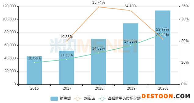 藍(lán)芩口服液具有清熱解毒、利咽消腫的功效,可用于急性咽炎、肺胃實熱證所致的咽痛、咽干、咽部灼熱等,為全國醫(yī)保乙類品種。近幾年來,藍(lán)芩口服液在中國城市實體藥店終端銷售額逐年上漲,占咽喉用藥市場比重逐年上升,預(yù)計2020年銷售額首次突破10億元,同比增長20.94%,占咽喉用藥市場比重23.33%。