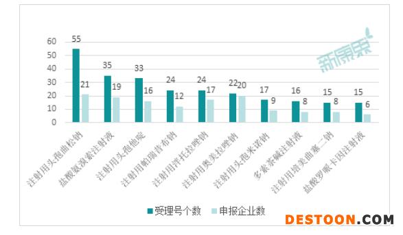 從注射劑一致性評價(jià)申報(bào)受理排名來看,注射用頭孢曲松鈉、鹽酸氨溴索注射液、注射用頭孢他啶、注射用帕瑞昔布鈉、注射用泮托拉唑鈉等品類,申報(bào)企業(yè)數(shù)量最多、最為激烈。