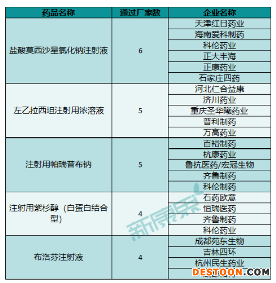 不過,申報(bào)數(shù)量較多并不代表過評幾率就一定高。從已通過(或視同通過)一致性評價(jià)的注射劑品類來看,跟申報(bào)品種并沒有太多交集。按照通過(或視同通過)廠家數(shù)的排名看,鹽酸莫西沙星氯化鈉注射液有6家通過,左乙拉西坦注射用濃溶液有5家,注射用帕瑞昔布鈉有5家。
