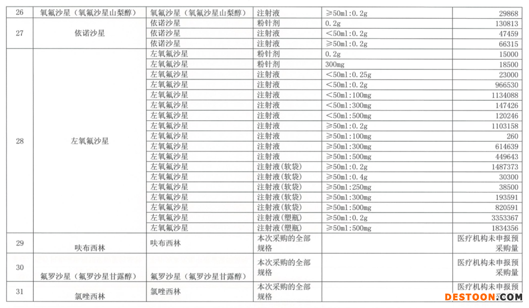 而本次更新的報(bào)量和品種名單顯示,呋布西林、氟羅沙星(氟羅沙星甘露醇)、氯唑西林、培氟沙星、羧芐西林等5個(gè)品種由于醫(yī)療機(jī)構(gòu)未申報(bào)預(yù)采購量的品種,被踢出帶量采購的品種范圍,帶量品種變更為28個(gè)。