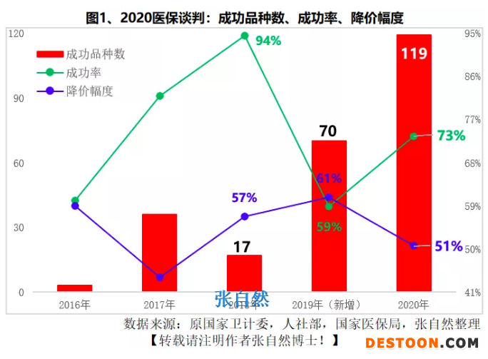 旨在以量換價的醫(yī)保談判于2016年由原國家衛(wèi)計委首次主導(dǎo),今年已是第五次,其中,新成立的國家醫(yī)保局主導(dǎo)了2018-2020的3次,本次共談判成功119個品種,幾乎相當(dāng)于前4次成功品種數(shù)的總和(126個)。