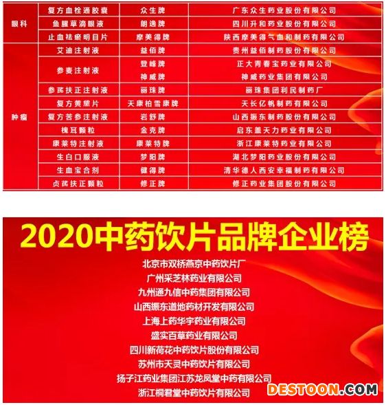 在第二屆中國中藥品牌建設大會上,中國中國協(xié)會公布了2020臨床價值中成藥品牌榜、中藥飲片品牌榜、中藥飲片品牌企業(yè)榜、老字號中藥品牌企業(yè)、中藥上市公司20強、中成藥企業(yè)100強六個榜單。