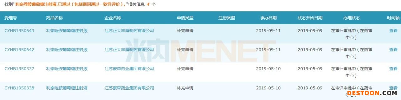截至目前,利奈唑胺葡萄糖注射液已有江蘇豪森藥業(yè)和江蘇正大豐海制藥兩家企業(yè)過評(píng),而在此之前,該產(chǎn)品并沒有企業(yè)過評(píng)。此外,浙江醫(yī)藥新昌制藥廠的一致性評(píng)價(jià)補(bǔ)充申請(qǐng)?jiān)趯徳u(píng)審批中(在藥審中心);廣州綠十字制藥、石家莊四藥、揚(yáng)子江藥業(yè)集團(tuán)上海海尼藥業(yè)等4家企業(yè)以仿制4類提交上市申請(qǐng)也在審評(píng)審批中(在藥審中心),獲批后將視同過評(píng)。