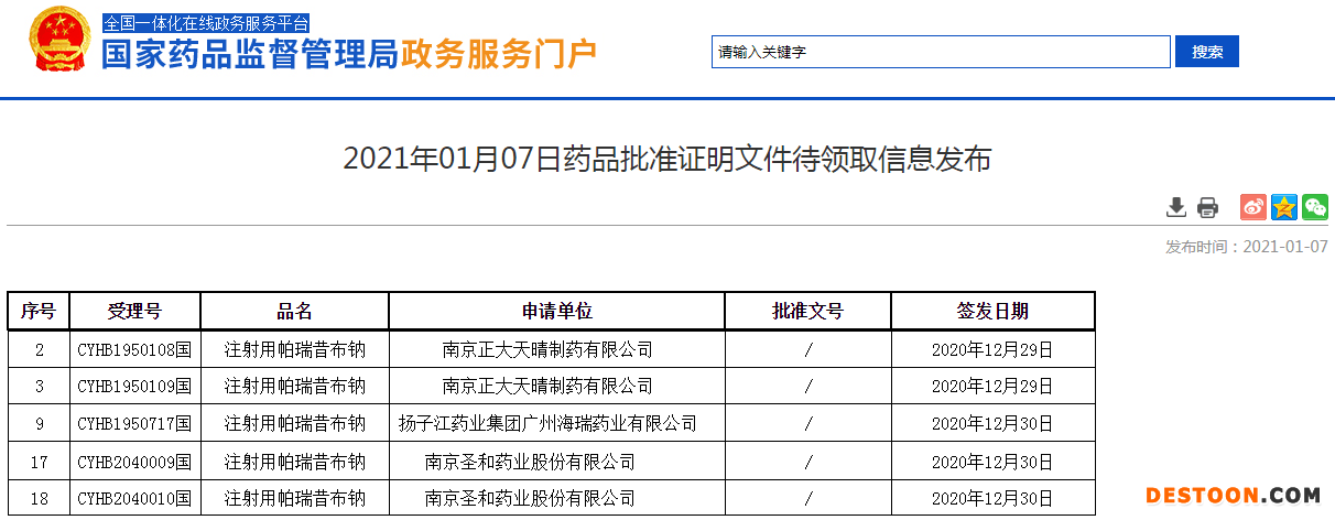 1月8日訊 1月7日,NMPA官網(wǎng)顯示,南京正大天晴、揚子江藥業(yè)集團、南京圣和藥業(yè)的注射用帕瑞昔布鈉通過一致性評價。1月6日,海正藥業(yè)公告稱,公司的注射用帕瑞昔布鈉過評。注射用帕瑞昔布鈉為第四批集采品種,截至目前已有11家藥企過評。