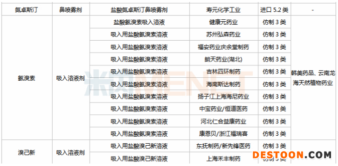 異丙托溴銨吸入溶液劑、乙酰半胱氨酸吸入溶液劑、左旋沙丁胺醇吸入溶液劑、氨溴索吸入溶液劑、特布他林吸入溶液劑、沙丁胺醇吸入溶液劑、復方異丙托溴銨吸入溶液劑、沙美特羅替卡松粉吸入劑等品種競爭激烈,申報企業(yè)數(shù)達5家及以上;氮卓斯汀、氯化鈉、氯醋甲膽堿、烏美溴銨維蘭特羅、沙美特羅氟替卡松等吸入劑暫時獨家申報。