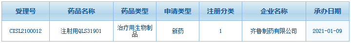 醫(yī)藥網(wǎng)1月12日訊 1月9日,齊魯制藥的1類新藥注射用QLS31901臨床申請獲得CDE承辦受理,受理號為CXSL2100012。注射用QLS31901是齊魯制藥2021年首個申報臨床的1類新藥。近年來,齊魯制藥在創(chuàng)新藥領(lǐng)域頻頻發(fā)力,2020年共有4款1類新藥提交臨床申請,均為治療用生物制品。