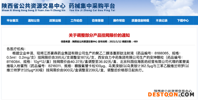 1月13日訊 1月12日,陜西省公共資源交易中心發(fā)布關(guān)于調(diào)整部分產(chǎn)品掛網(wǎng)限價(jià)的通知,根據(jù)企業(yè)申請,江蘇豪森的聚乙二醇洛塞那肽注射液(規(guī)格:0.5ml:0.2mg/支)掛網(wǎng)限價(jià)由395元/支調(diào)整至187元/支、北京科園信海醫(yī)藥經(jīng)營有限公司代理的氟替美維吸入粉霧劑掛網(wǎng)限價(jià)由900元/盒調(diào)整至239元/盒。