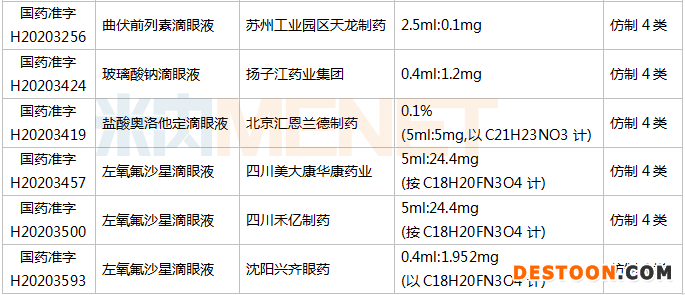 米內(nèi)網(wǎng)數(shù)據(jù)顯示,2020年上半年中國城市公立醫(yī)院、縣級(jí)公立醫(yī)院、城市社區(qū)中心以及鄉(xiāng)鎮(zhèn)衛(wèi)生院(簡稱中國公立醫(yī)療機(jī)構(gòu))終端地夸磷索眼用制劑銷售額同比增長超過300%,地夸磷索鈉滴眼液生產(chǎn)企業(yè)僅有參天制藥一家。目前,該產(chǎn)品齊魯制藥和恒瑞醫(yī)藥子公司成都盛迪醫(yī)藥均以仿制4類提交上市申請?jiān)趯徳u(píng)審批中(在藥審中心)。