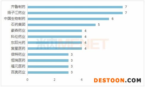入選品種達(dá)3個及以上的原研藥企(單位:個)