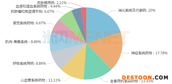 45個藥品涵蓋10個治療類別,涉及藥品數(shù)量TOP3類別分別為神經(jīng)系統(tǒng)藥物、全身用抗感染藥物、消化系統(tǒng)及代謝藥,涉及的藥品數(shù)量分別有9、8、6個。米內(nèi)網(wǎng)數(shù)據(jù)顯示,2019年中國公立醫(yī)療機(jī)構(gòu)化學(xué)藥終端神經(jīng)系統(tǒng)藥物、全身用抗感染藥物、消化系統(tǒng)及代謝藥三大治療領(lǐng)域銷售規(guī)模均超過1000億元。三大治療領(lǐng)域多個品種被納入此次集采,將對其用藥格局帶來影響。