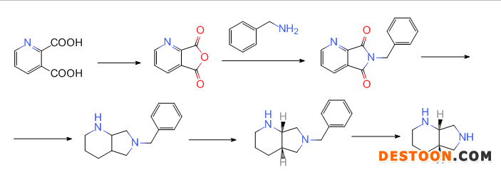 從結(jié)構(gòu)來(lái)看主要由兩個(gè)片段組成,片段一為(S,S)-2,8-二氮雜二環(huán)[4,3,0]壬烷(CAS:151213-40-0),作為本品合成的起始原料之一;合成路線(xiàn)如下: