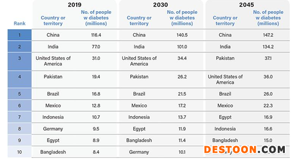根據(jù)IDFDiabetes Atlas最新披露的數(shù)據(jù),2019年糖尿病患者人數(shù),中國(guó)排名第一,總?cè)藬?shù)約為1.164億人,第二為印度,約有7700萬(wàn)糖尿病患者,第三為美國(guó),有3100萬(wàn)糖尿病患者。另外,中國(guó)同時(shí)也是老年糖尿病人數(shù)最多的國(guó)家,目前中國(guó)65歲以上的糖尿病患者已經(jīng)達(dá)到3550萬(wàn),預(yù)計(jì)到2030年將會(huì)增加到5430萬(wàn),到2045年更是可能會(huì)增長(zhǎng)到7810萬(wàn)。